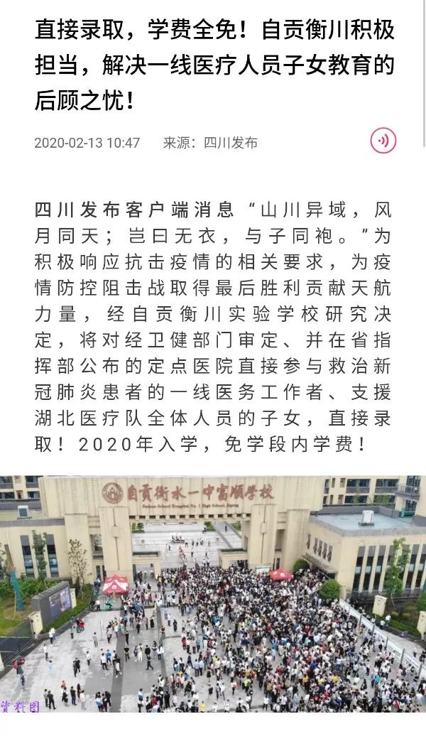 2月12日,正值全國人民眾志成城抗擊新冠疫情,為全力支持奮戰在一線的醫護人員的工作,解決他們的子女就學的后顧之憂,廣州高新教育集團旗下三所基礎教育學校四川自貢衡川實驗學校、江西贛州大余衡水實驗學校和浙江嘉興平湖杭州灣實驗學校同一天相繼對外發布了對一線醫療工作者的子女進行直接錄取,免學段內學費的重要公告。