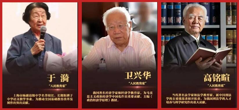 “授予國(guó)家勛章和國(guó)家榮譽(yù)稱號(hào),是對(duì)作出突出貢獻(xiàn)的杰出人士授予的國(guó)家最高榮譽(yù)。”于漪、高銘暄、衛(wèi)興華被授予“人民教育家”國(guó)家榮譽(yù)稱號(hào)。