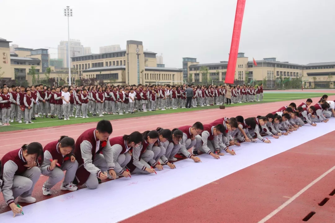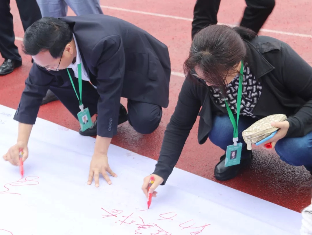 之后,師生們來(lái)到了百米長(zhǎng)卷面前,用筆墨書寫了心聲和誓言。大家不忘初心,牢記使命。主席臺(tái)上,高一年級(jí)的張?jiān)婄?、曾伊萌、孔令羽和鄭暢同學(xué)為我們帶來(lái)了歌曲演唱《最初的夢(mèng)想》。歌聲飄蕩在衡川運(yùn)動(dòng)場(chǎng)的上空,最初的夢(mèng)想永遠(yuǎn)在我們心中。