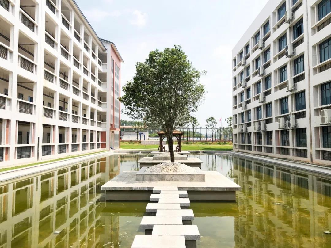 這是一所充滿活力、生機、風景優美的學校。樓群林立,整齊地排列著,令人頓生敬畏之感。池面在陽光的照耀下顯得波光粼粼,池里的魚兒盡情瀟灑地歡游。當太陽升起時,那是陽光與花蕾的邂逅,每一片葉子在與陽光相遇后,盡情吐灑著夏天的熱情。不論近看遠看,那些點綴于樓前樓后的綠色,都是一道亮麗的風景,每每令人駐足賞閱心曠神怡。
