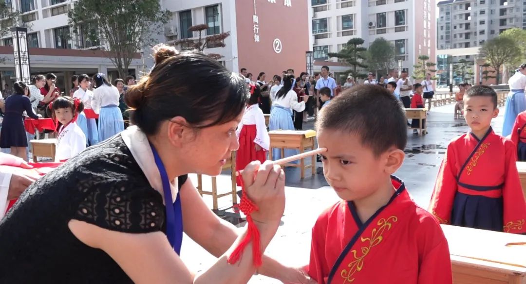 學(xué)校領(lǐng)導(dǎo)和老師們俯下身子,笑意盈盈地逐個(gè)為孩子們點(diǎn)朱砂,一張張稚氣的臉上多了一分靈氣和自信。