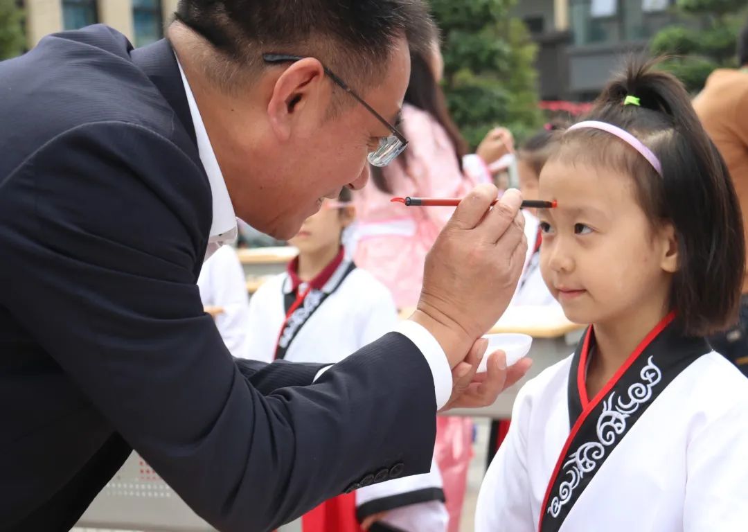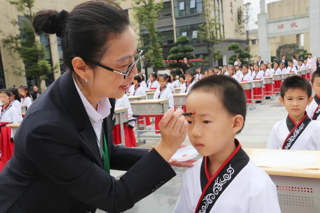 第二項由尹校長、徐校長帶領老師們給孩子們“啟智” ,一起將鮮紅的朱砂,在孩子們的額頭正中點痣,為他們開天眼。一顆顆紅痣在額上閃耀,飽含父母、長輩、學校的美好祝愿,在孩了們心中勾畫起一道道亮麗的風景。