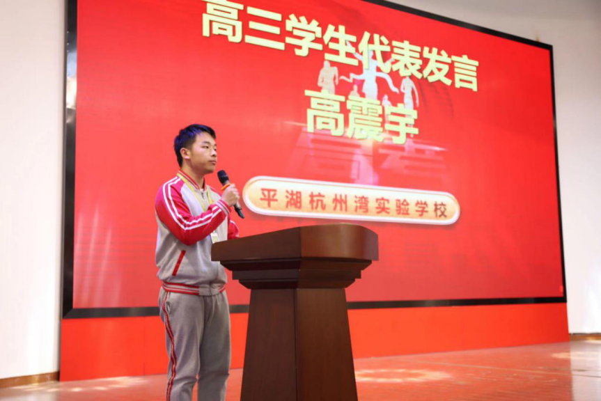 高三一班的高震宇同學作為優(yōu)秀學生代表,為所有高三學生喊出壯志豪言,表達高考必勝的信念。